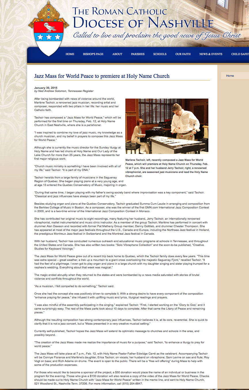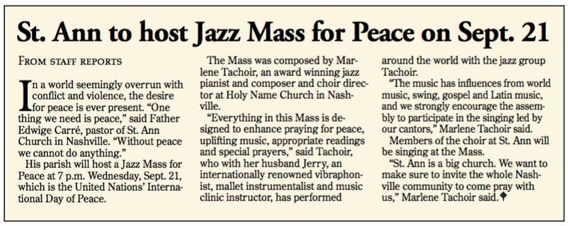 “I am a retired priest of 53 years. I attended the first Mass for Peace written by Marlene Tachoir. I had a couple of questions about the Mass. One was will it be a presentation that will over shadow the Eucharist. The answer is no. It complemented the Eucharist. There is a gentleness to the music that encourages a sense of peace. In fact it highlights the message of peace and reconciliation of the Eucharist.